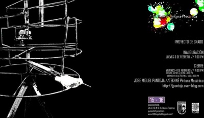TEKHNÉ Pintura Mecánica es un proyecto que integra a dos modalidades de representación plástica, la tridimensional y la bidimensional; siendo su principal objetivo la realización de producciones visuales en dos dimensiones, en este caso pinturas, por medio de la previa construcción de máquinas y mecanismos que las producen, las cuales hacen parte de la instalación y la configuración total de la obra.
