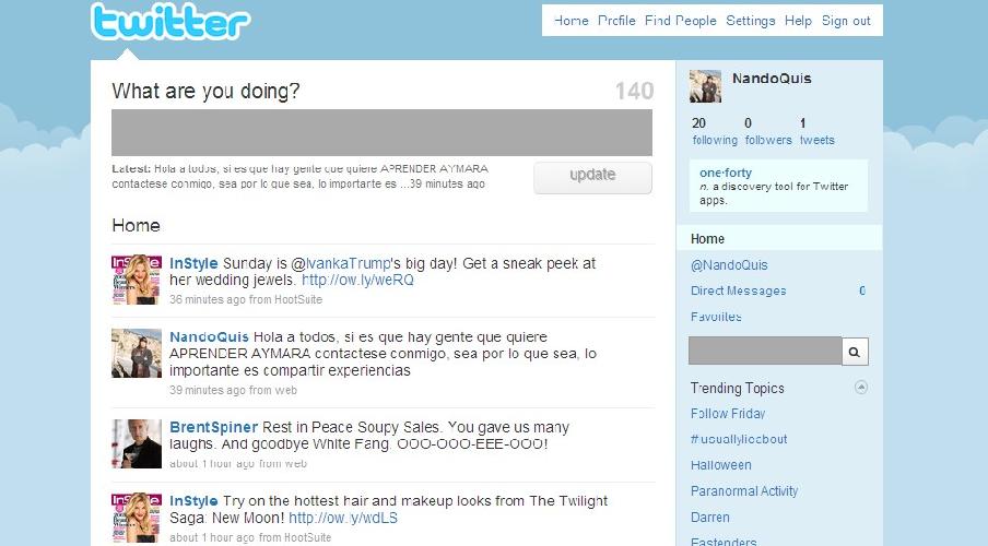 Lo interesante es que sólo se escriben un máximo de 140 caracteres por vez, claro que puedes seguir escribiendo todo el día si quieres. Es muy característico porque empieza con la frase: What are you doing? (¿Qué tienes para decir?).